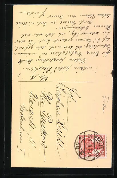 Personenbezogene Daten auf der Rückseite der Karte wurden durch blauen Textmarker unkenntlich gemacht. Die blauen Stellen sind auf die Vorderseite durchgeweicht und wirken sich negativ auf das Postkartenfoto aus