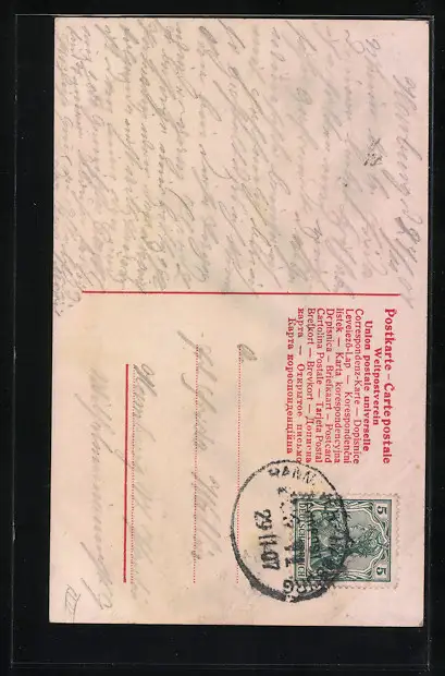 Personenbezogene Daten auf der Rückseite der Karte wurden durch blauen Textmarker unkenntlich gemacht. Die blauen Stellen sind auf die Vorderseite durchgeweicht und wirken sich negativ auf das Postkartenfoto aus
