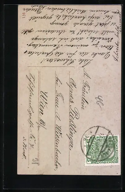 Personenbezogene Daten auf der Rückseite der Karte wurden durch blauen Textmarker unkenntlich gemacht. Die blauen Stellen sind auf die Vorderseite durchgeweicht und wirken sich negativ auf das Postkartenfoto aus