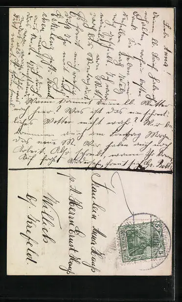 Personenbezogene Daten auf der Rückseite der Karte wurden durch blauen Textmarker unkenntlich gemacht. Die blauen Stellen sind auf die Vorderseite durchgeweicht und wirken sich negativ auf das Postkartenfoto aus