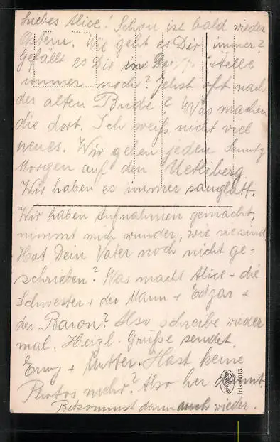 Personenbezogene Daten auf der Rückseite der Karte wurden durch blauen Textmarker unkenntlich gemacht. Die blauen Stellen sind auf die Vorderseite durchgeweicht und wirken sich negativ auf das Postkartenfoto aus