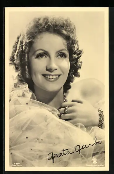 AK Schauspielerin Greta Garbo, Portrait lächelnd mit lockigem Haar