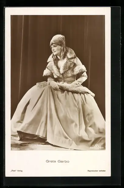 AK Schauspielerin Greta Garbo in langem Kleid mit Pelz