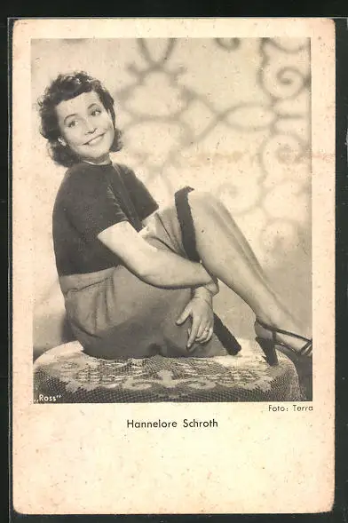 AK Schauspielerin Hannelore Schroth auf einem Tisch sitzend