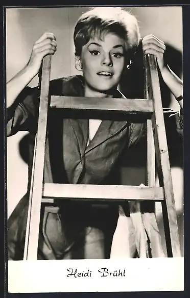 AK Schauspielerin Heidi Brühl auf einer Leiter
