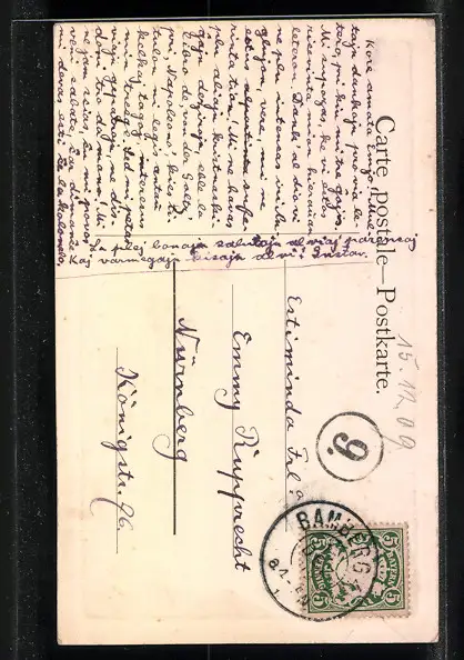 Personenbezogene Daten auf der Rückseite der Karte wurden durch blauen Textmarker unkenntlich gemacht. Die blauen Stellen sind auf die Vorderseite durchgeweicht und wirken sich negativ auf das Postkartenfoto aus