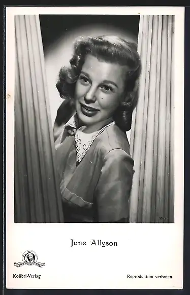 AK Schauspielerin June Allyson schaut durch einen Vorhang