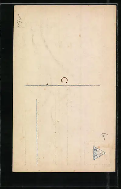 Personenbezogene Daten auf der Rückseite der Karte wurden durch blauen Textmarker unkenntlich gemacht. Die blauen Stellen sind auf die Vorderseite durchgeweicht und wirken sich negativ auf das Postkartenfoto aus