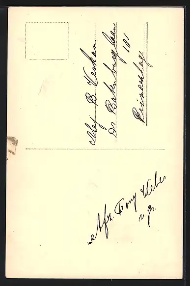Personenbezogene Daten auf der Rückseite der Karte wurden durch blauen Textmarker unkenntlich gemacht. Die blauen Stellen sind auf die Vorderseite durchgeweicht und wirken sich negativ auf das Postkartenfoto aus