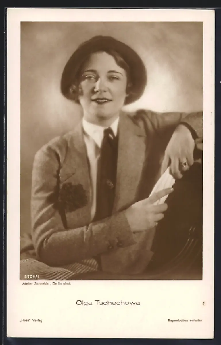 AK Schauspielerin Olga Tschechowa mit Hut sitzt auf Sessel