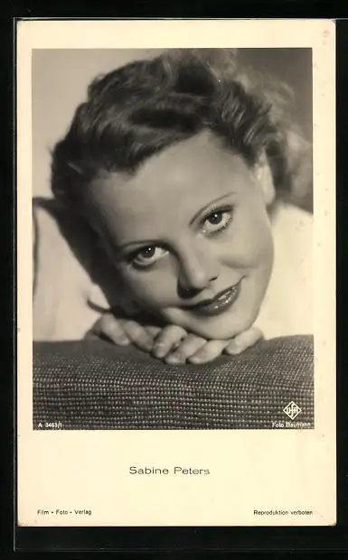 AK Schauspielerin Sabine Peters lächelnd mit dem Kopf auf einer Lehne liegend