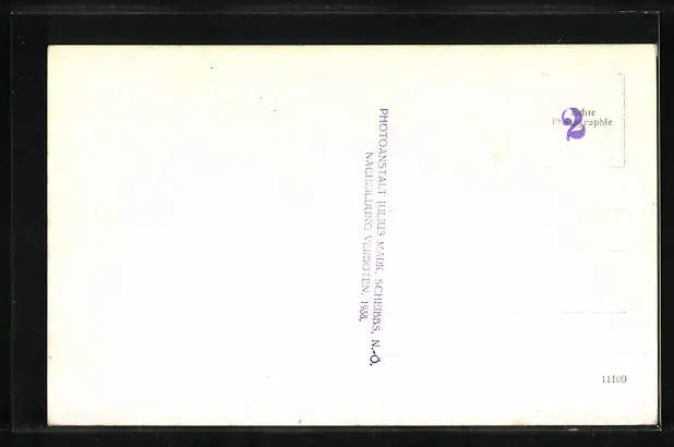Personenbezogene Daten auf der Rückseite der Karte wurden durch blauen Textmarker unkenntlich gemacht. Die blauen Stellen sind auf die Vorderseite durchgeweicht und wirken sich negativ auf das Postkartenfoto aus