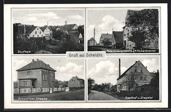 AK Schelditz, Gasthof u. Ziegelei, Materialwarenhandlung M. Aschenbrenner, Schelditzer Strasse