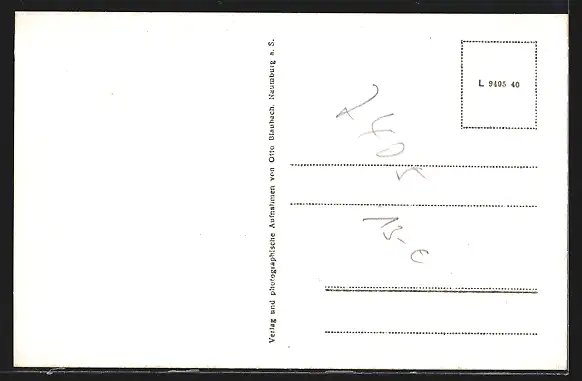 Personenbezogene Daten auf der Rückseite der Karte wurden durch blauen Textmarker unkenntlich gemacht. Die blauen Stellen sind auf die Vorderseite durchgeweicht und wirken sich negativ auf das Postkartenfoto aus