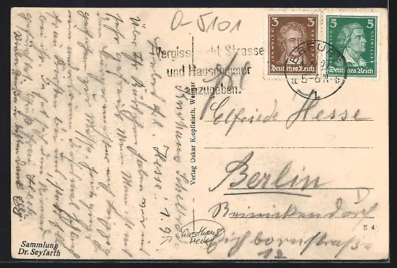 Personenbezogene Daten auf der Rückseite der Karte wurden durch blauen Textmarker unkenntlich gemacht. Die blauen Stellen sind auf die Vorderseite durchgeweicht und wirken sich negativ auf das Postkartenfoto aus