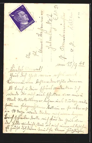 Personenbezogene Daten auf der Rückseite der Karte wurden durch blauen Textmarker unkenntlich gemacht. Die blauen Stellen sind auf die Vorderseite durchgeweicht und wirken sich negativ auf das Postkartenfoto aus