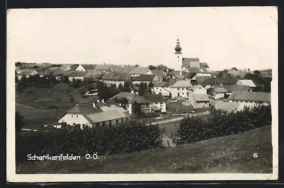 AK Schenkenfelden /O.-Ö., Ortsansicht mit Strasse von einer Anhöhe aus