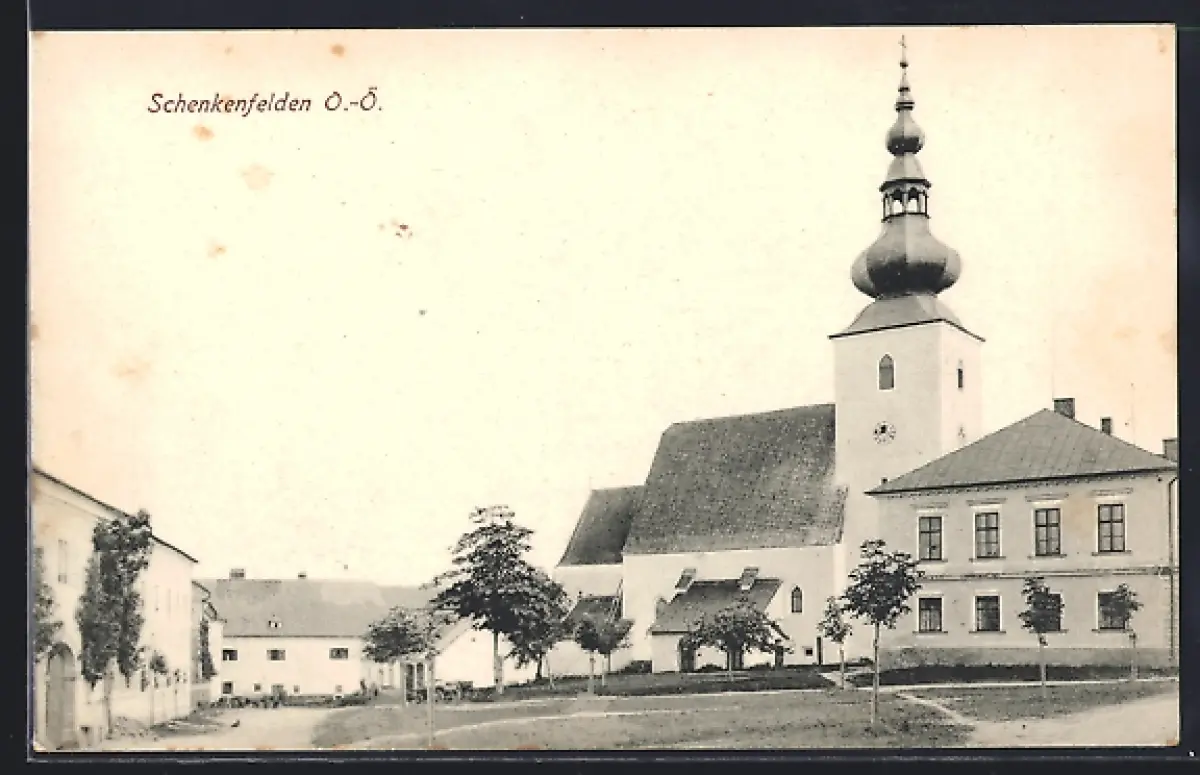 AK Schenkenfelden /O.-Ö., Strassenpartie mit Kirche