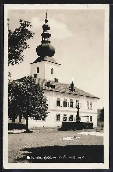 AK Schenkenfelden /O. Ö., Volksschule mit Denkmal und Kirchturm