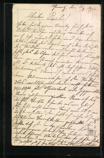 Personenbezogene Daten auf der Rückseite der Karte wurden durch blauen Textmarker unkenntlich gemacht. Die blauen Stellen sind auf die Vorderseite durchgeweicht und wirken sich negativ auf das Postkartenfoto aus