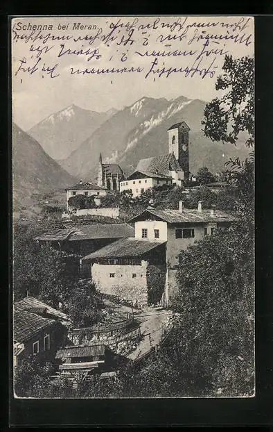 AK Schenna bei Meran, Ortspartie mit Kirche