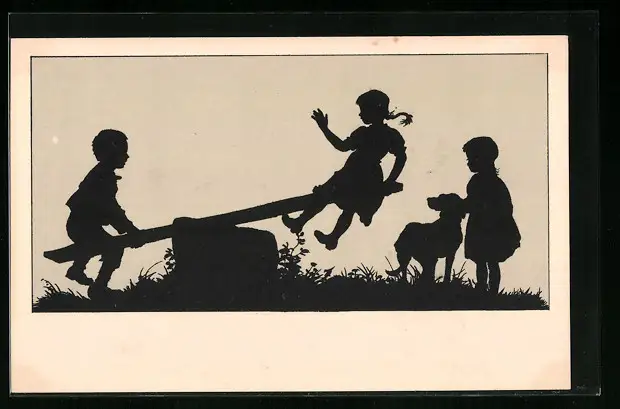 AK Scherenschnitt, Junge und Mädchen auf der Wippe