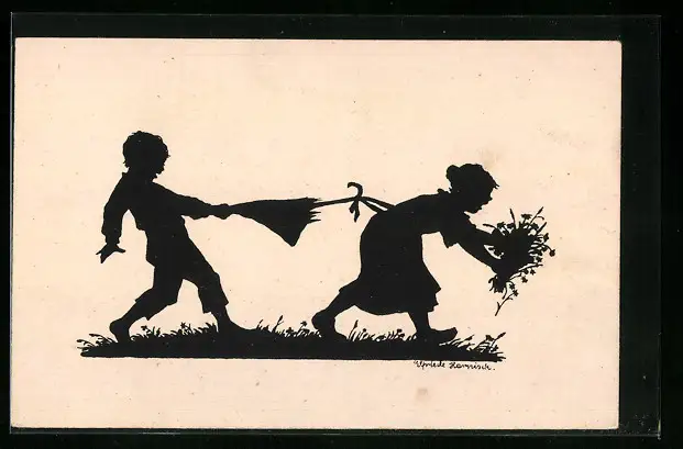 AK Scherenschnitt, Junge zieht Mädchen mit Schirm an der Schürze