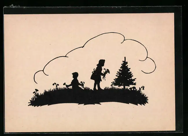 AK Scherenschnitt, Kinderpaar pflückt Blumen