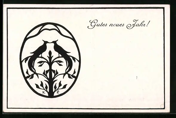 AK Scherenschnitt, Zwei Vögel auf einer Pflanze, Neujahrsgruss