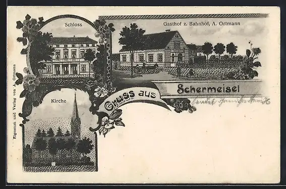 AK Schermeisel, Gasthof zum Bahnhof, Schloss, Kirche