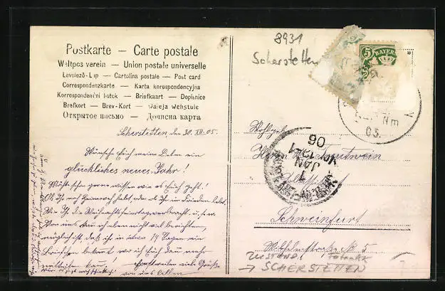 gelaufen 1905, Briefmarke entfernt, Stecknadelloch oben mittig, guter Zustand