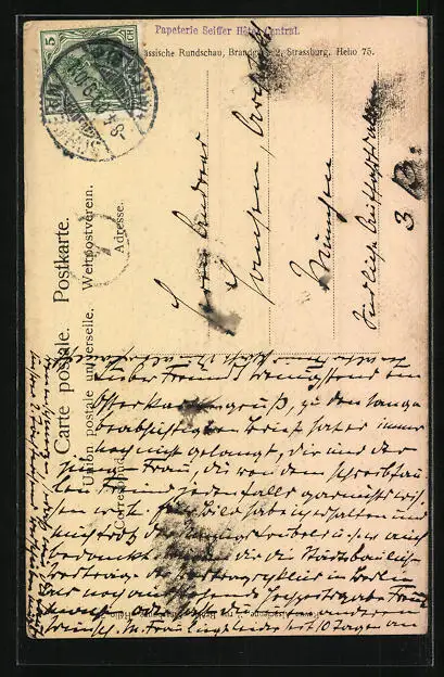 Personenbezogene Daten auf der Rückseite der Karte wurden durch blauen Textmarker unkenntlich gemacht. Die blauen Stellen sind auf die Vorderseite durchgeweicht und wirken sich negativ auf das Postkartenfoto aus