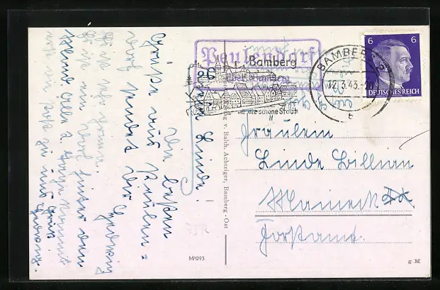 Personenbezogene Daten auf der Rückseite der Karte wurden durch blauen Textmarker unkenntlich gemacht. Die blauen Stellen sind auf die Vorderseite durchgeweicht und wirken sich negativ auf das Postkartenfoto aus