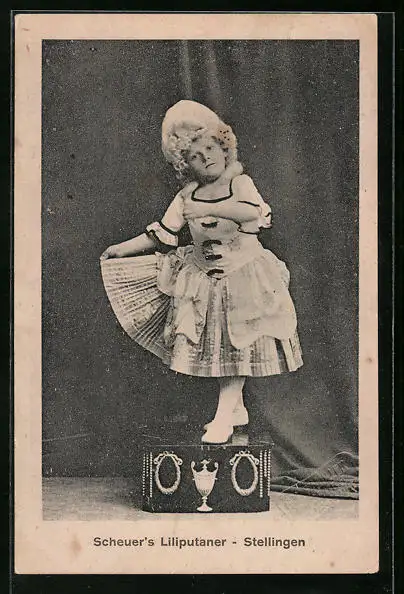 AK Scheuer's Liliputaner-Stellingen, Mädchen im Kostümkleid