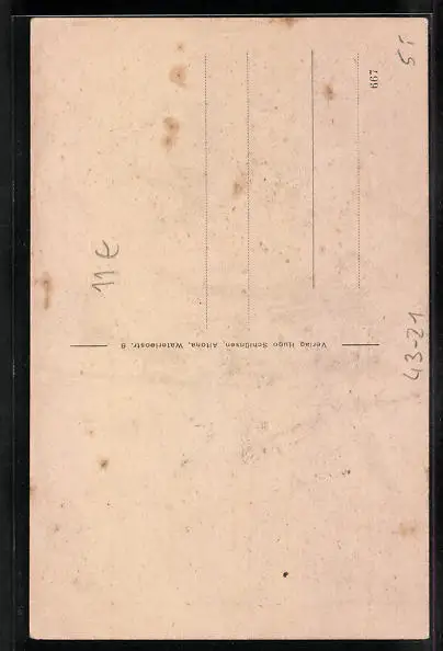 Personenbezogene Daten auf der Rückseite der Karte wurden durch blauen Textmarker unkenntlich gemacht. Die blauen Stellen sind auf die Vorderseite durchgeweicht und wirken sich negativ auf das Postkartenfoto aus