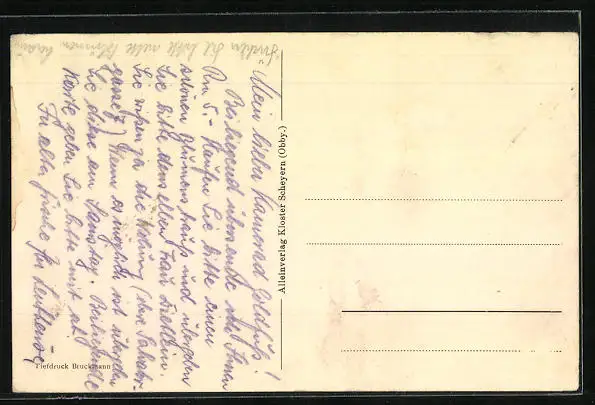 Personenbezogene Daten auf der Rückseite der Karte wurden durch blauen Textmarker unkenntlich gemacht. Die blauen Stellen sind auf die Vorderseite durchgeweicht und wirken sich negativ auf das Postkartenfoto aus