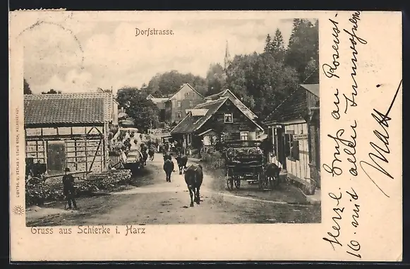 AK Schierke i. Harz, Dorfstrasse mit Rindern und Wohngebäuden