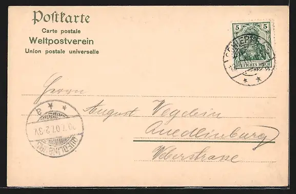 alte Ansichtskarte, gelaufen 1907, Eckknick rechts oben, guter Zustand