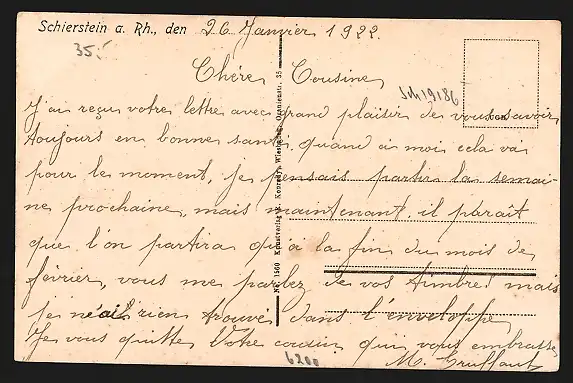 Personenbezogene Daten auf der Rückseite der Karte wurden durch blauen Textmarker unkenntlich gemacht. Die blauen Stellen sind auf die Vorderseite durchgeweicht und wirken sich negativ auf das Postkartenfoto aus