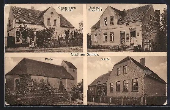 AK Schilda, Geschäftshaus M. Eulitz, Bäckerei P. Kockrick und Schule