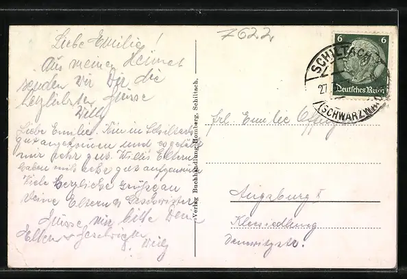Personenbezogene Daten auf der Rückseite der Karte wurden durch blauen Textmarker unkenntlich gemacht. Die blauen Stellen sind auf die Vorderseite durchgeweicht und wirken sich negativ auf das Postkartenfoto aus
