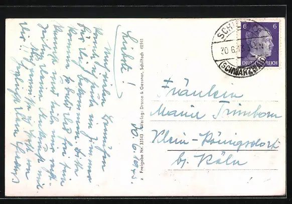 alte Ansichtskarte, gelaufen 1943, Bugspur li. oben, guter Zustand