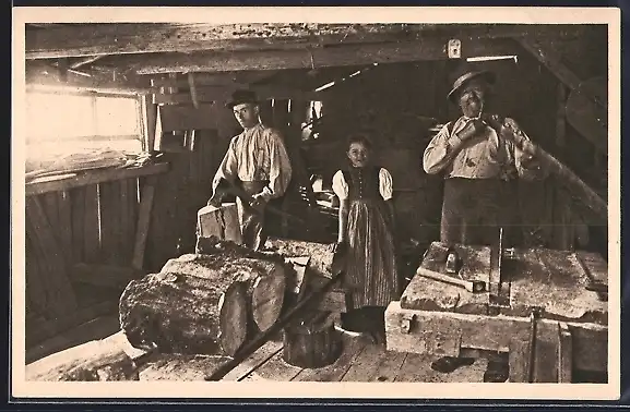 AK Schindelmacher, Holzfäller in einer Hütte bei der Arbeit