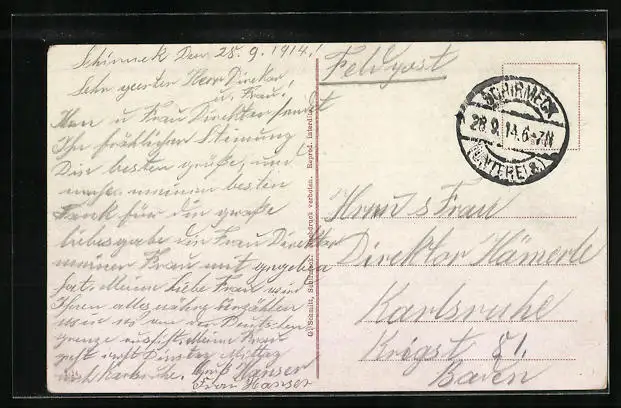 alte Ansichtskarte, gelaufen 1914 als Feldpost, Eckknick re. oben, Stempelspur, guter Zustand