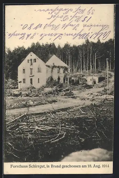 AK Schirrgut, Forsthaus, in Brand geschossen am 18. Aug. 1914