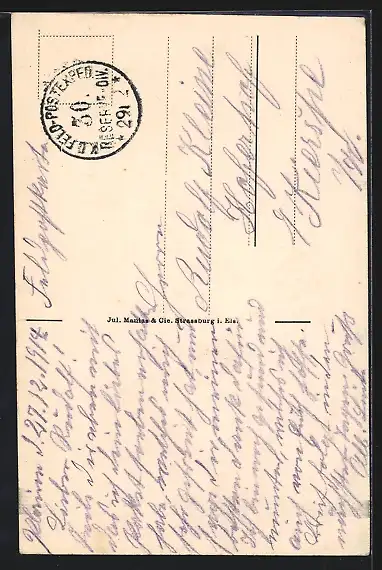 Personenbezogene Daten auf der Rückseite der Karte wurden durch blauen Textmarker unkenntlich gemacht. Die blauen Stellen sind auf die Vorderseite durchgeweicht und wirken sich negativ auf das Postkartenfoto aus
