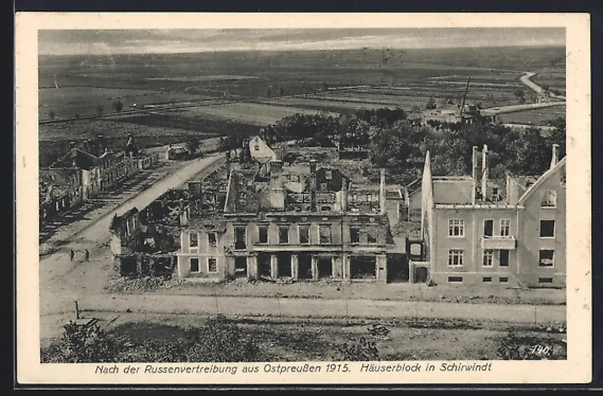 AK Schirwindt, Zerstörter Häuserblock aus der Vogelschau