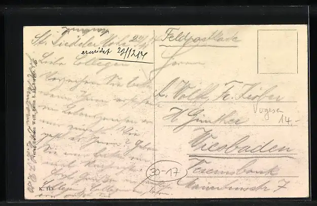 Personenbezogene Daten auf der Rückseite der Karte wurden durch blauen Textmarker unkenntlich gemacht. Die blauen Stellen sind auf die Vorderseite durchgeweicht und wirken sich negativ auf das Postkartenfoto aus