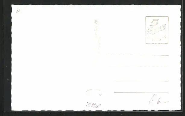 Personenbezogene Daten auf der Rückseite der Karte wurden durch blauen Textmarker unkenntlich gemacht. Die blauen Stellen sind auf die Vorderseite durchgeweicht und wirken sich negativ auf das Postkartenfoto aus