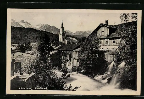 AK Schladming, Ortspartie mit Blick auf Kirche